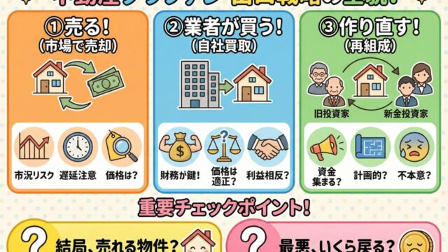 資産形成Exit戦略(出口)とは?不動産クラファンの売却・自社買取・再組成を徹底比較 不動産クラウドファンディングのExit戦略(出口)を数字とリスクで徹底解説。売却・自社買取・再組成の違い、財務リスクや資金調達リスクまで投資家目線で比較します。 2025.12.21資産形成