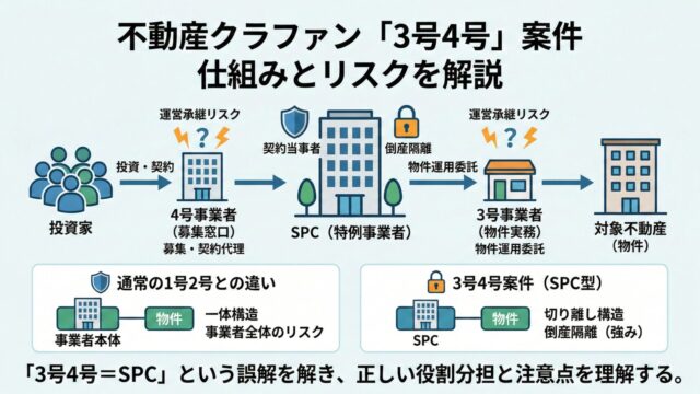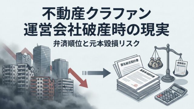 資産形成不動産クラウドファンディング|運営会社が破産したら?弁済順位と元本毀損(不特法1号2号) 不動産クラウドファンディング(不特法・匿名組合型)で運営会社(第1号)が破産したら?第1号/第2号の違い、弁済順位と回収の現実、元本大幅毀損の理由、債権届出の手順、分別管理の誤解まで解説。 2026.02.27資産形成