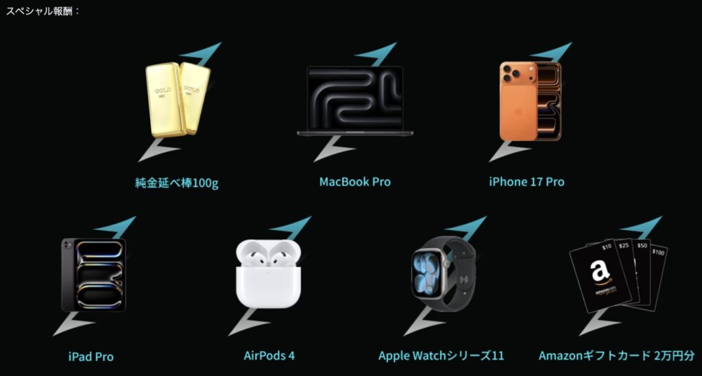 • さらに、金の延べ棒や最新の Apple 製品セットなど、取引量上位者向けの 豪華な物品賞品 も併設されています。