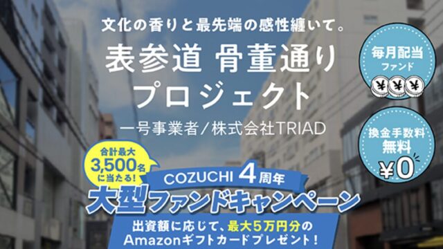 資産形成【COZUCHI】表参道 骨董通りプロジェクトの投資考察! COZUCHIから表参道 骨董通りプロジェクトが開催されました。本ファンドに投資するべきかどうかを「年利」「リスク」「事業内容」の視点で解説しています。またCOZUCHIの過去実績などもまとめており、本案件の投資の有無の参考にしていただければ幸いです。 2025.11.21資産形成