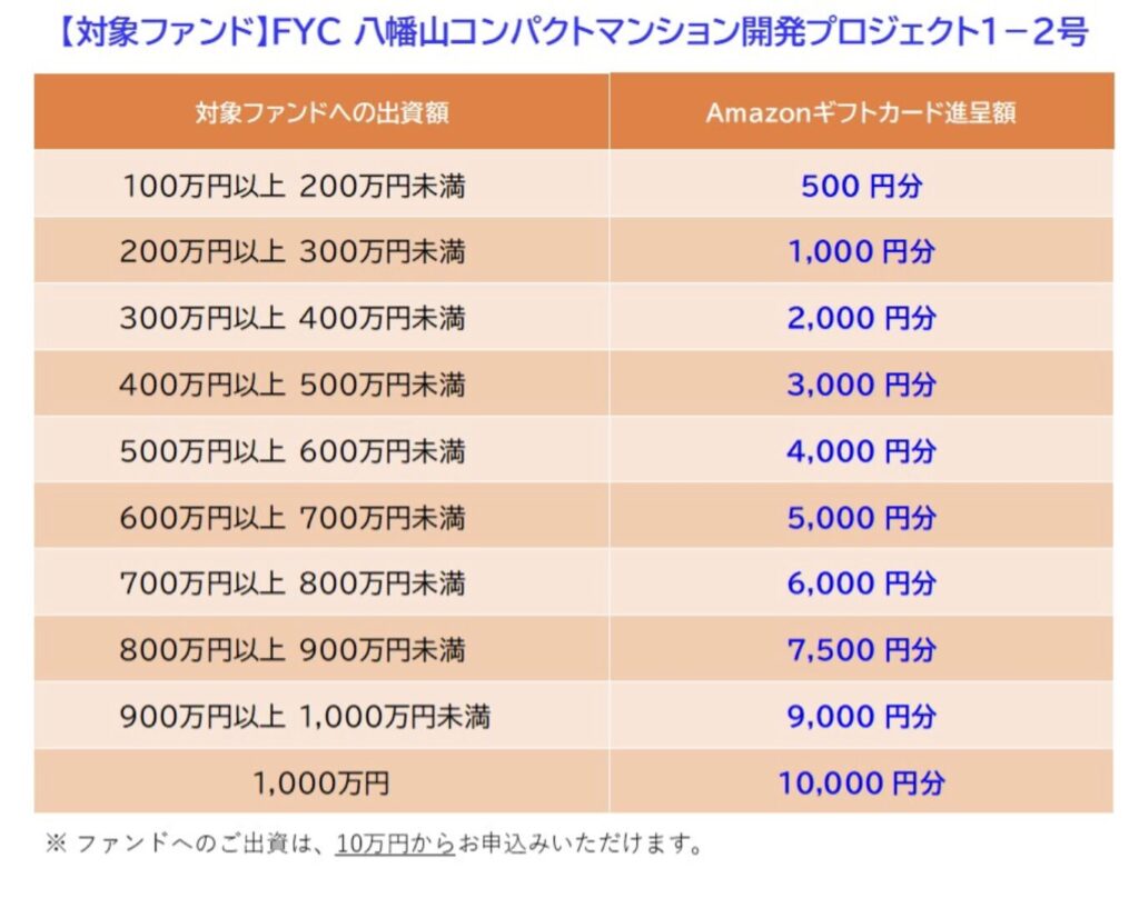この後話しますが、Funvestは投資キャンペーンと称して、投資額に応じたAmazonギフト券配布キャンペーンが行われることがあります。