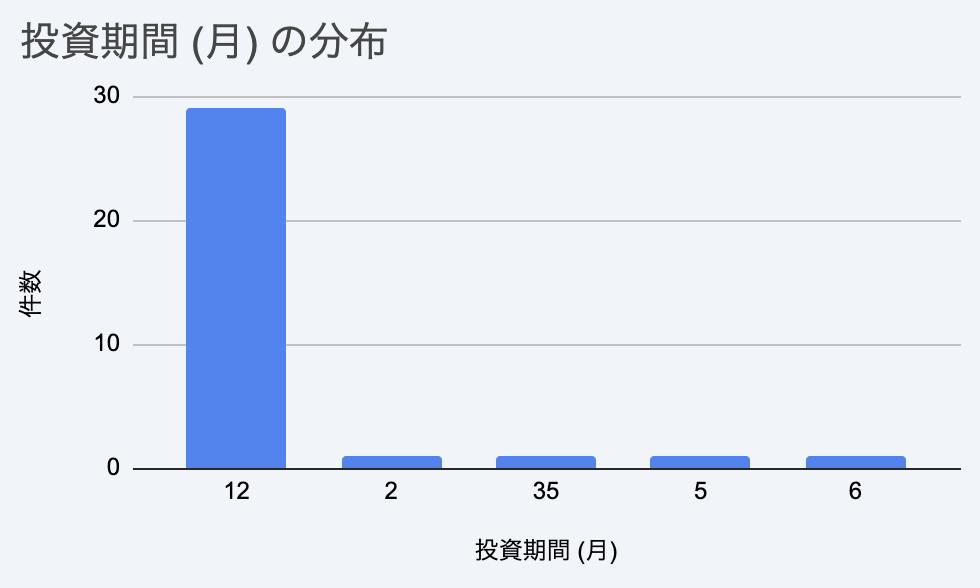 実際のファンドの利回り/投資期間のヒストグラムを掲載しておきます。