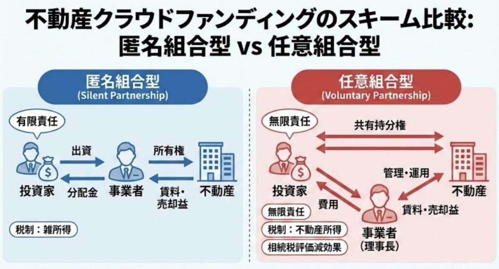不動産特定共同事業法および金融商品取引法に基づき運営され、短期運用型(匿名組合型)と中長期運用型(任意組合型)の2タイプを用意。