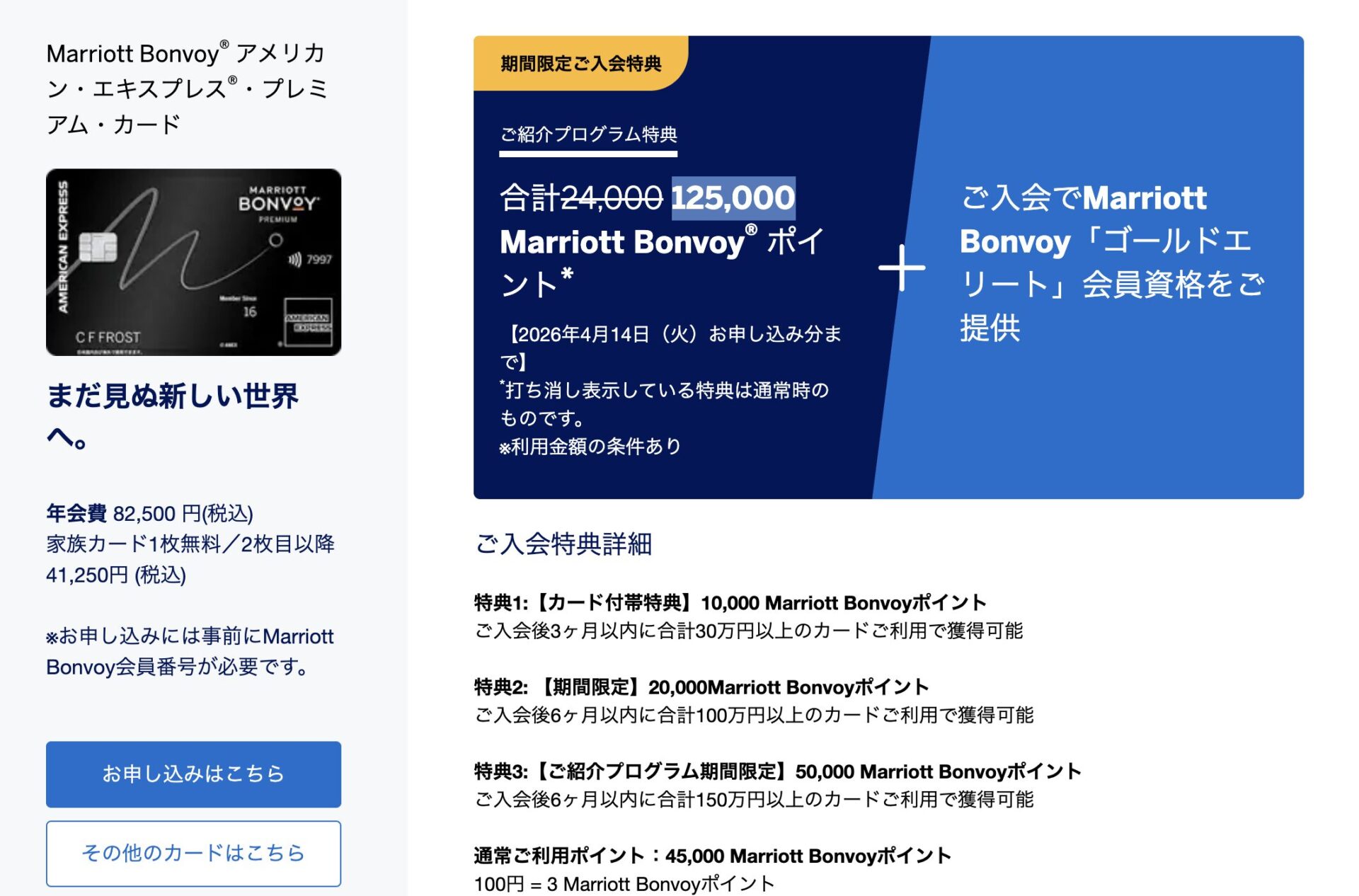 「MBAプレミアムカード(Marriott Bonvoy® アメックス・プレミアム)」は、いま入会すると“最大125,000ポイント”を狙える期間限定オファーが出ています。