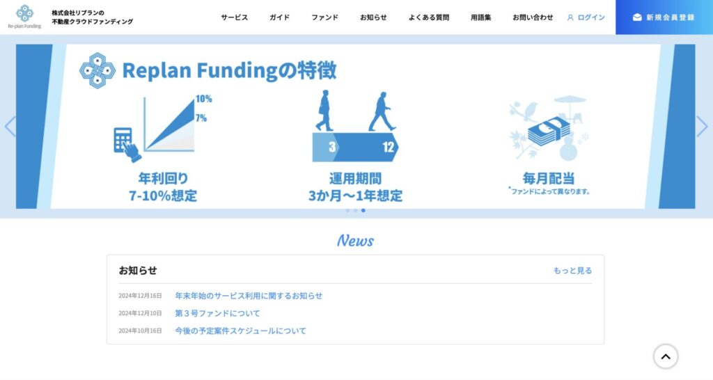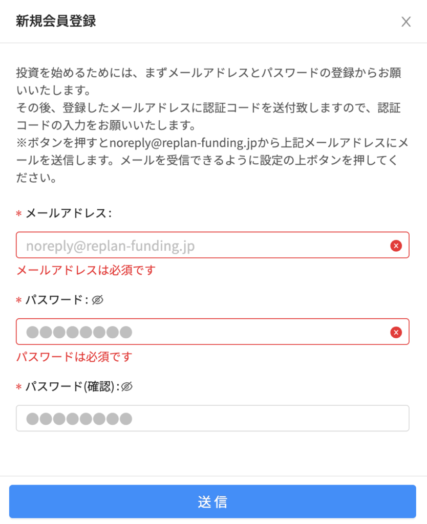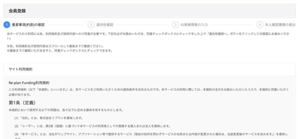 Re-plan Funding公式HPから「新規会員登録」をクリックし、登録を始めます。