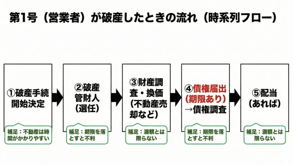 第1号(営業者)が破産すると、投資家目線ではだいたい次の流れになります。