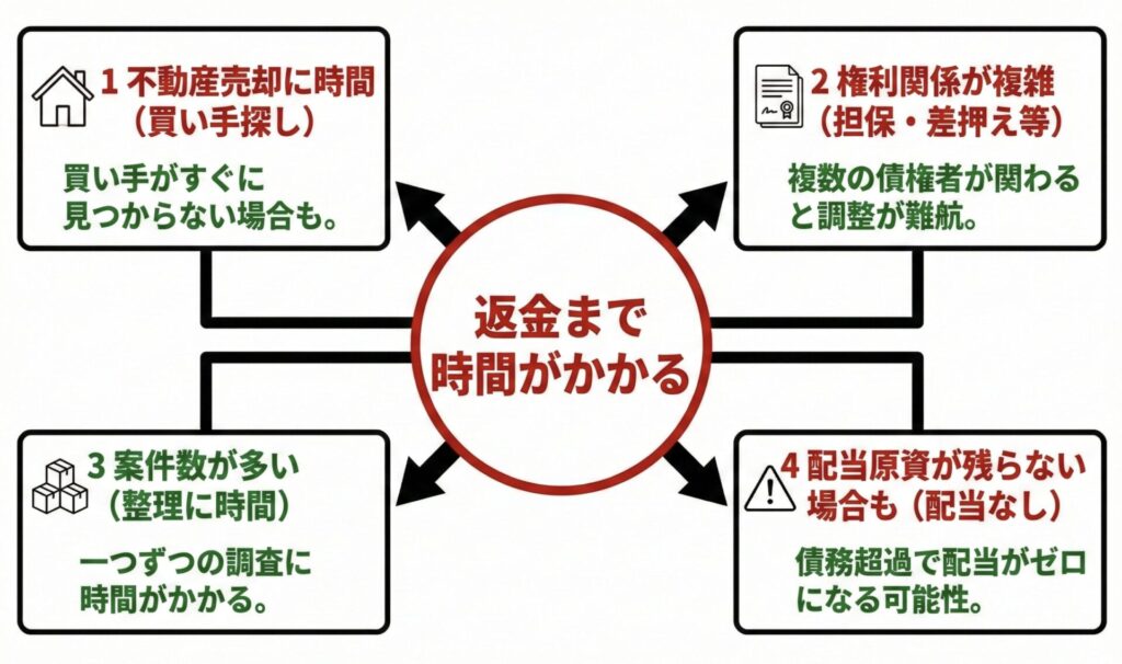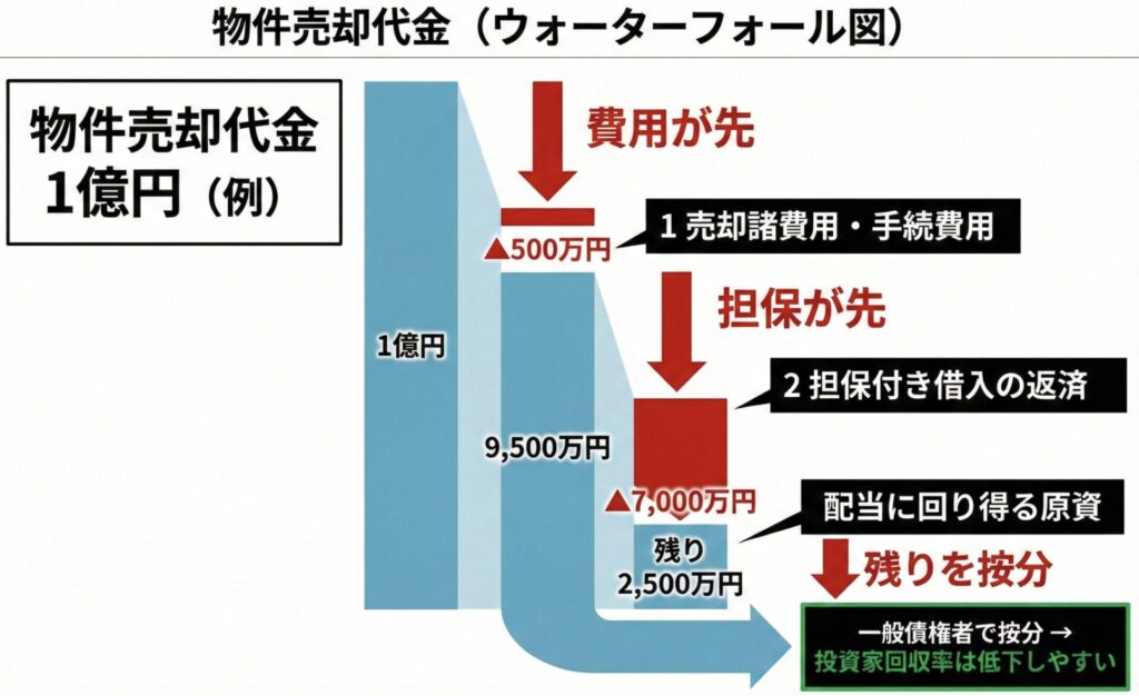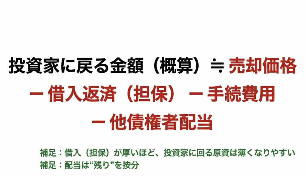 担保が刺さっている・借入が厚い・手続費用が嵩むと、投資家の列に回ってくる原資は簡単に薄くなります。