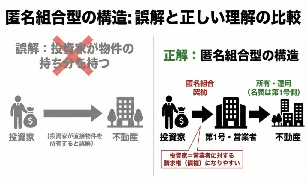 そして重要なのは、匿名組合の出資は物件の持ち分ではなく、営業者に対する請求権(債権)になりやすいという点です。
