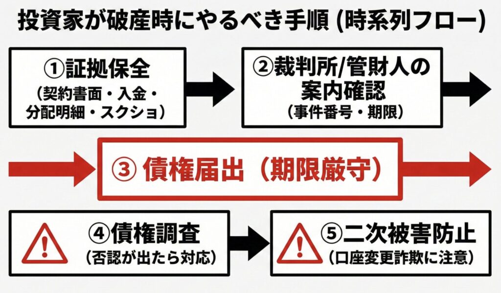 この場合も結局、公式の案内(裁判所・管財人・第1号の公告等)を起点に動くのが安全です。