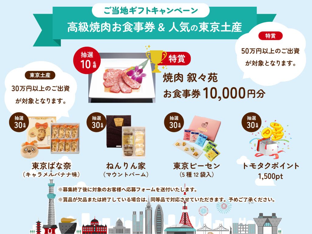 トモタクのファンドに出資してTwitterで「#トモタクと#ご当地返礼ギフト」をつけながら投資報告することで、ご当地ギフトが当たるキャンペーンを盛んに行われています。