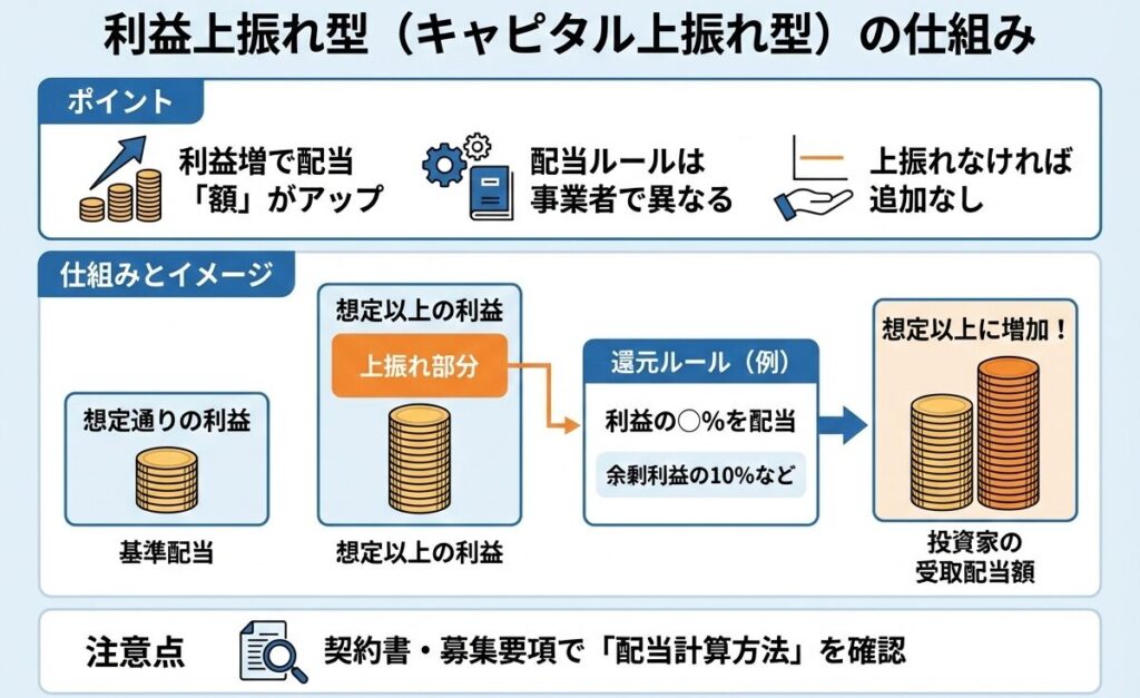利益上振れ型では想定より高い売却益が出た際に配当額そのものが増え、成功報酬のようなリターンを狙えます。