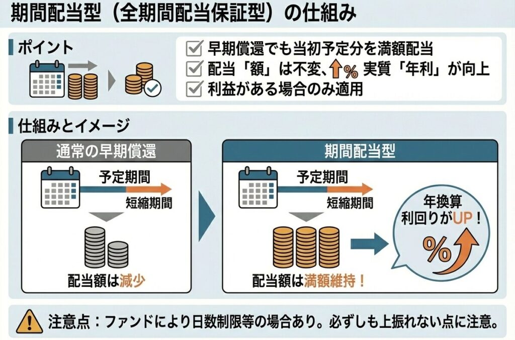 期間配当型は、早期に償還された場合でも「〇〇日間の運用期間の配当」を全額受け取れる方式です。