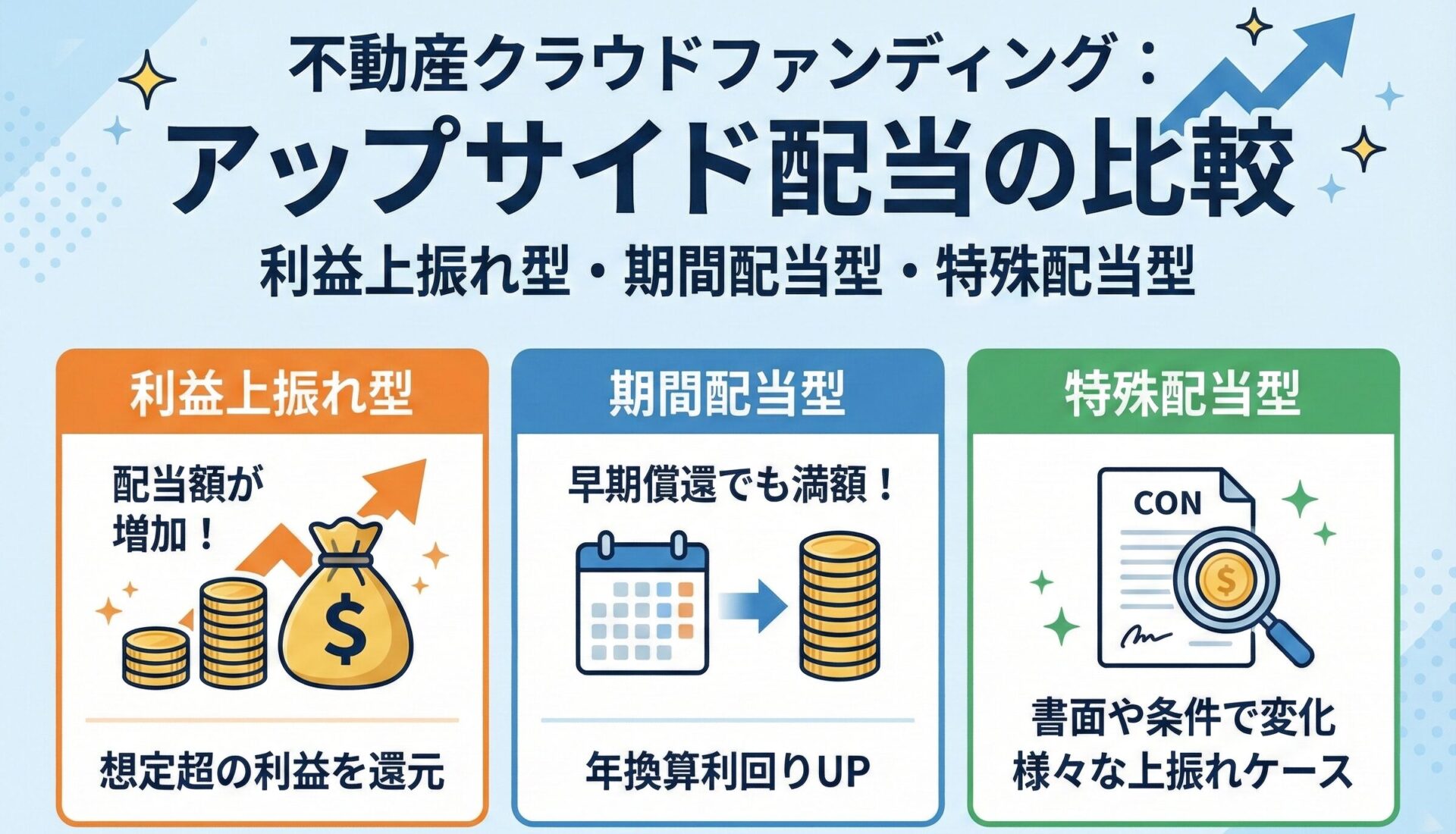 不動産クラウドファンディングのアップサイド配当とは?利益上振れ型・期間配当型・特殊配当型を比較