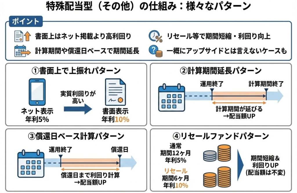 利益の増加に応じて配当額が増える「利益上振れ型」、運用期間が短縮しても予定期間分の配当を保証する「期間配当型」、その他のケースの「特殊配当型」に大別されます。