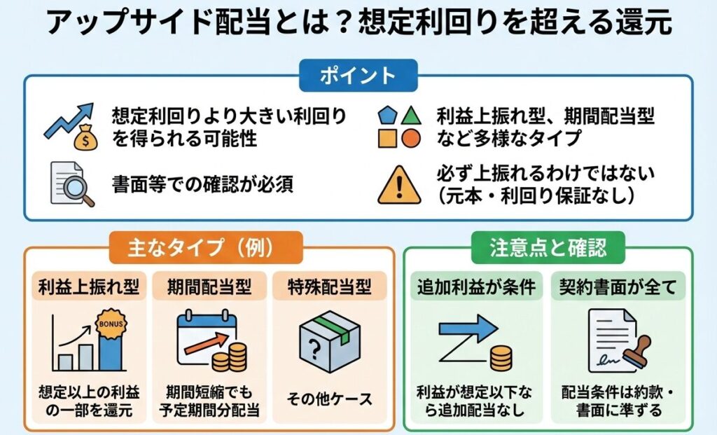 運用で想定以上の利益が生じた場合、その一部を投資家に還元する仕組みがアップサイド配当です。